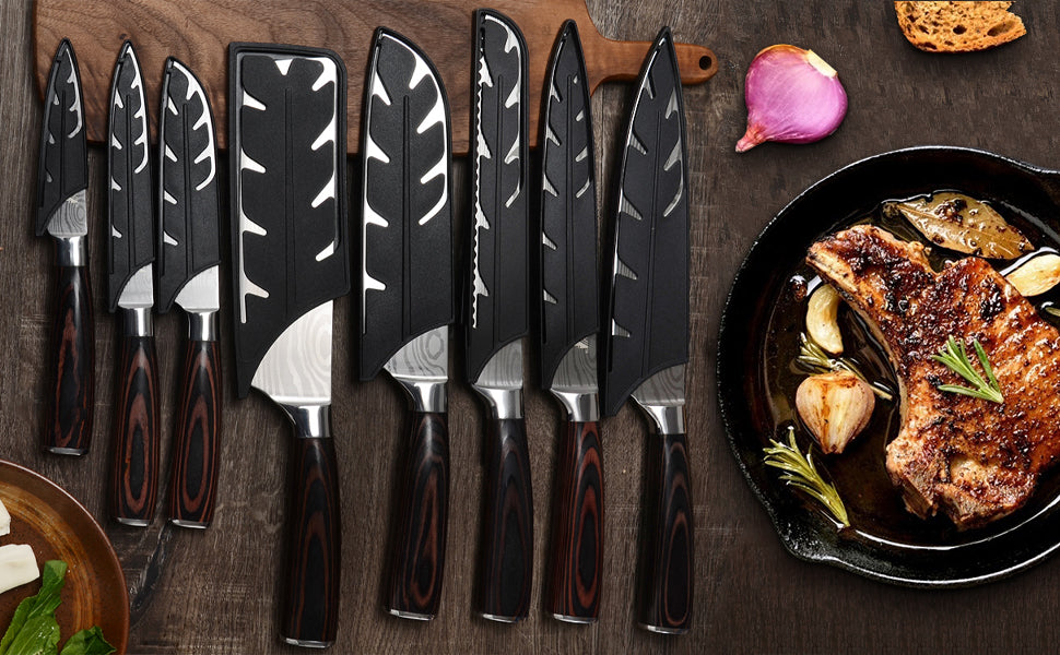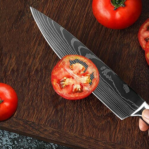 Med vårt laserskurna Damaskus-mönstrade blad får du en enastående skärprecision som gör varje snitt enkelt och kontrollerat. Perfekt för allt från tunna skivor till tjocka bitar, vilket ger professionella resultat varje gång.