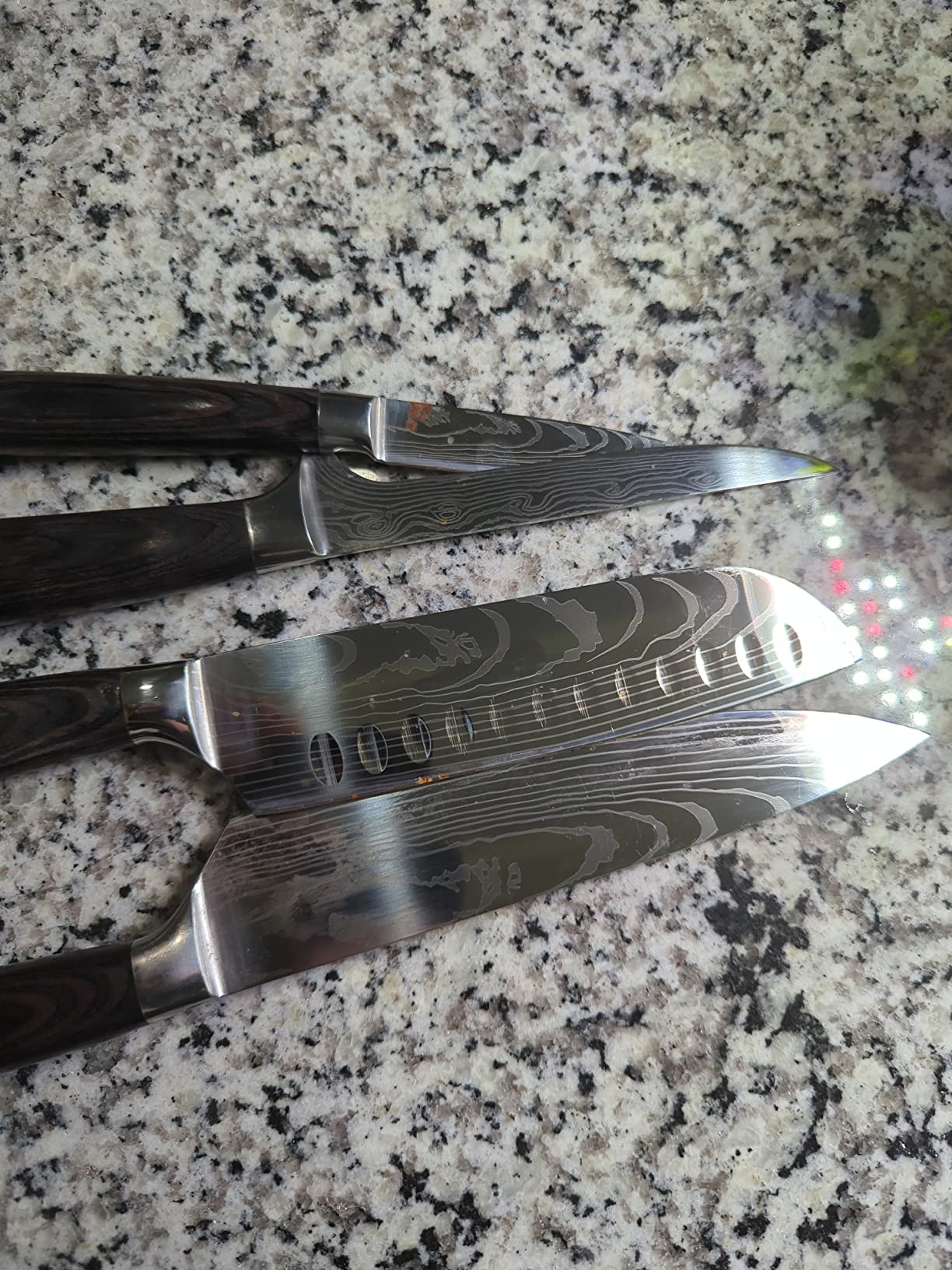 Scandicslice-knivarna är tillverkade av högkvalitativt rostfritt stål med en precisionstillverkad Laser Damascus-yta, vilket garanterar långvarig skärpa och hållbarhet. Varje kniv är noggrant balanserad och ergonomiskt utformad för en bekväm och säker användning i köket.