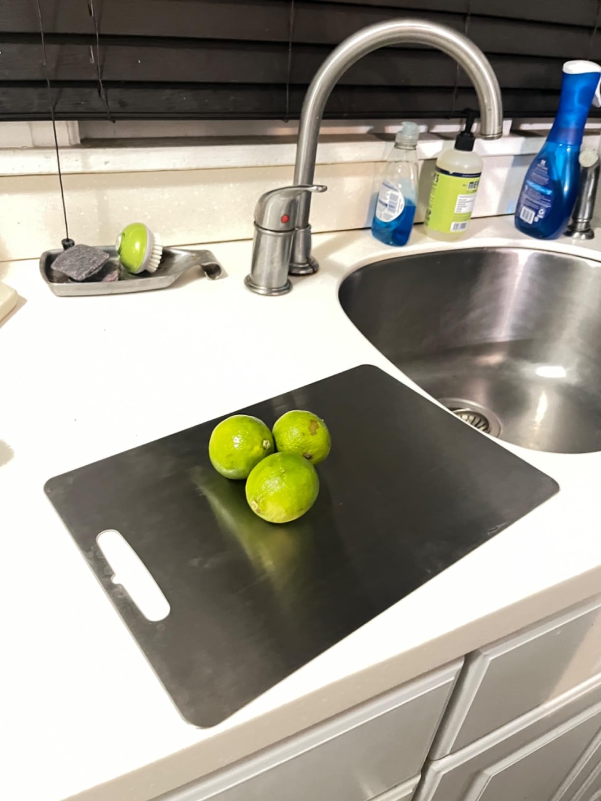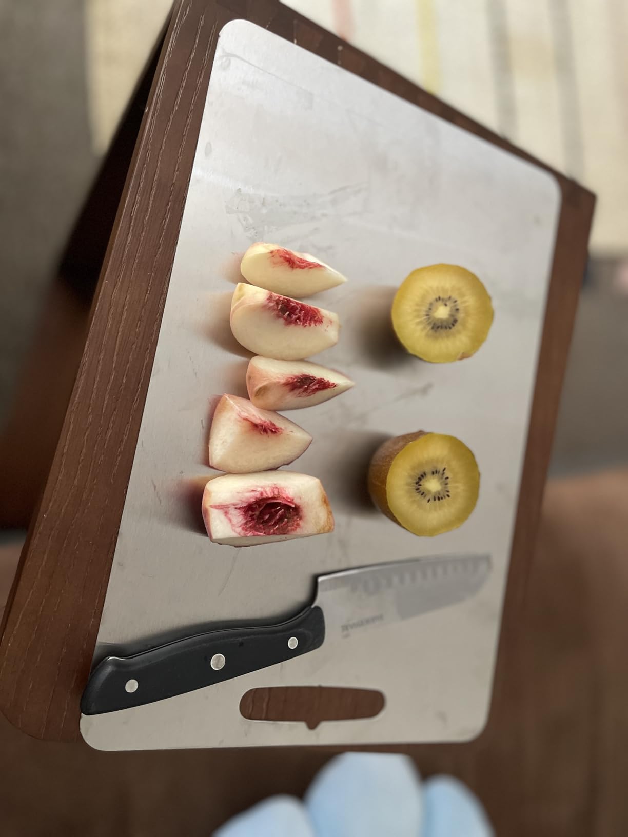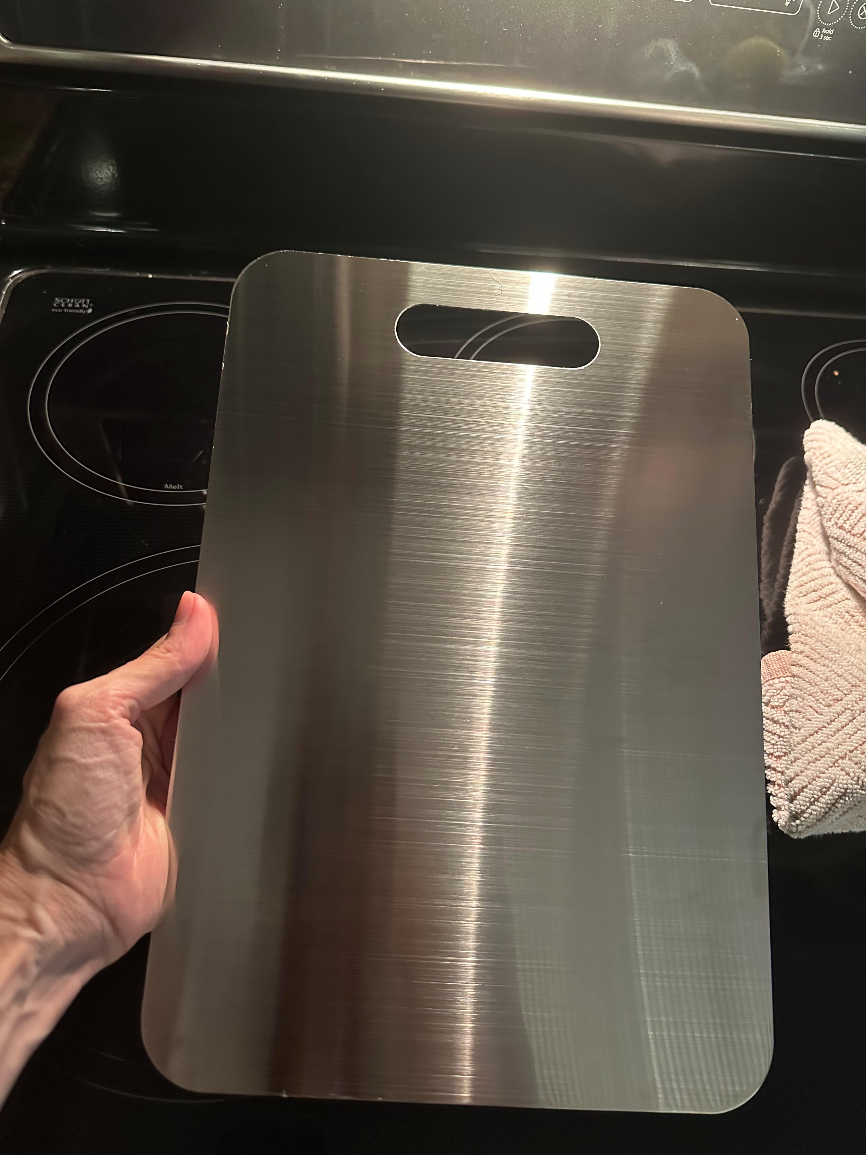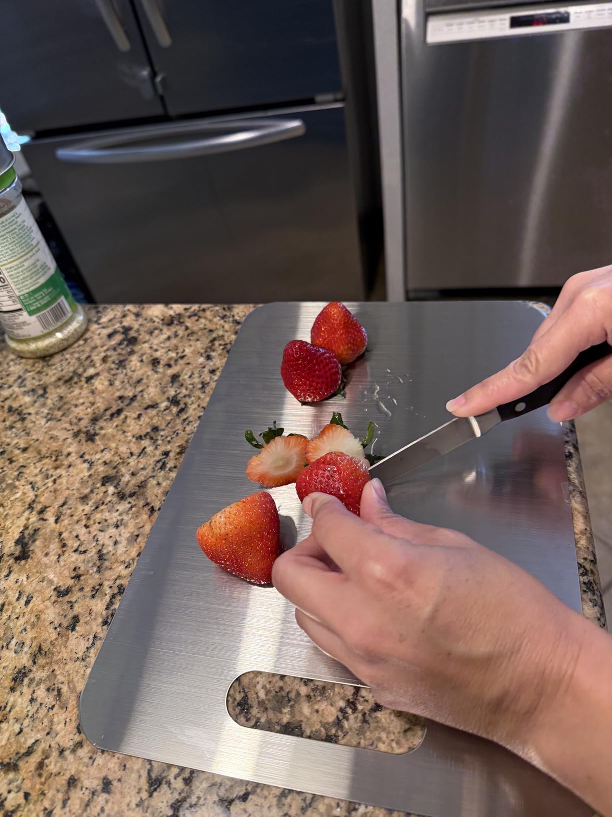 Jag älskar mitt titan-skärbräda! Håller knivarna vassa, lätt att rengöra och mycket stabil. Perfekt för vardagsbruk.